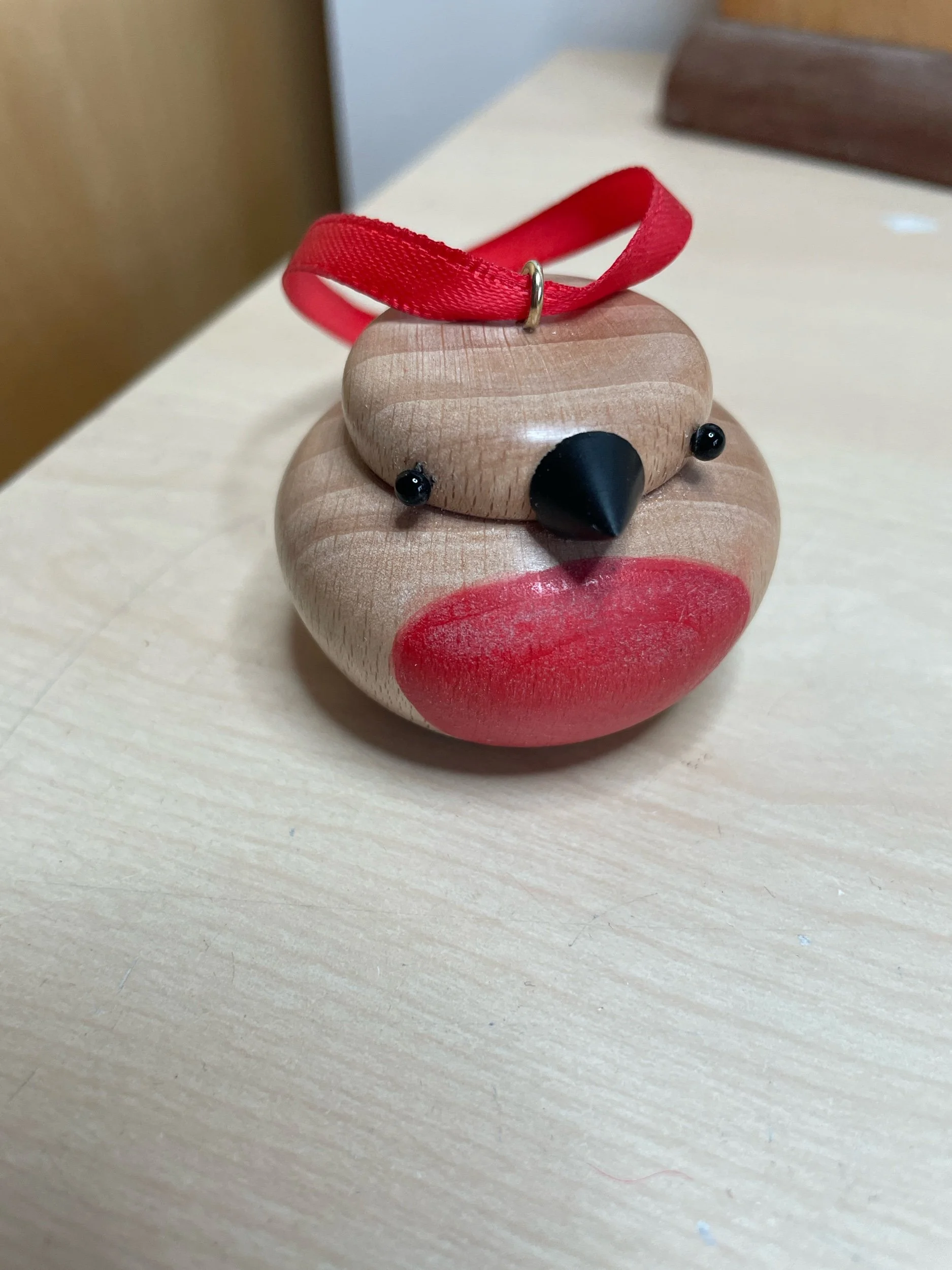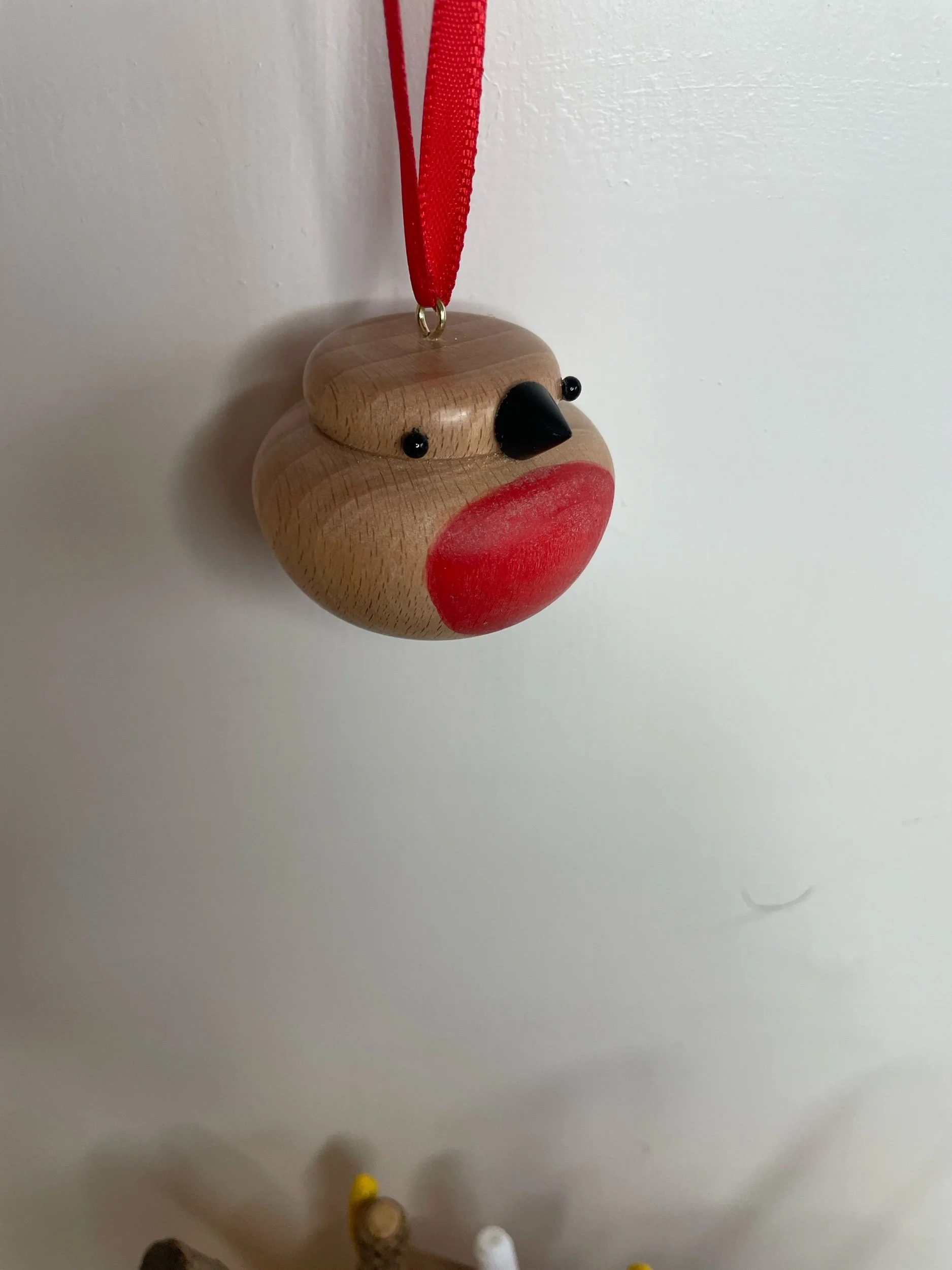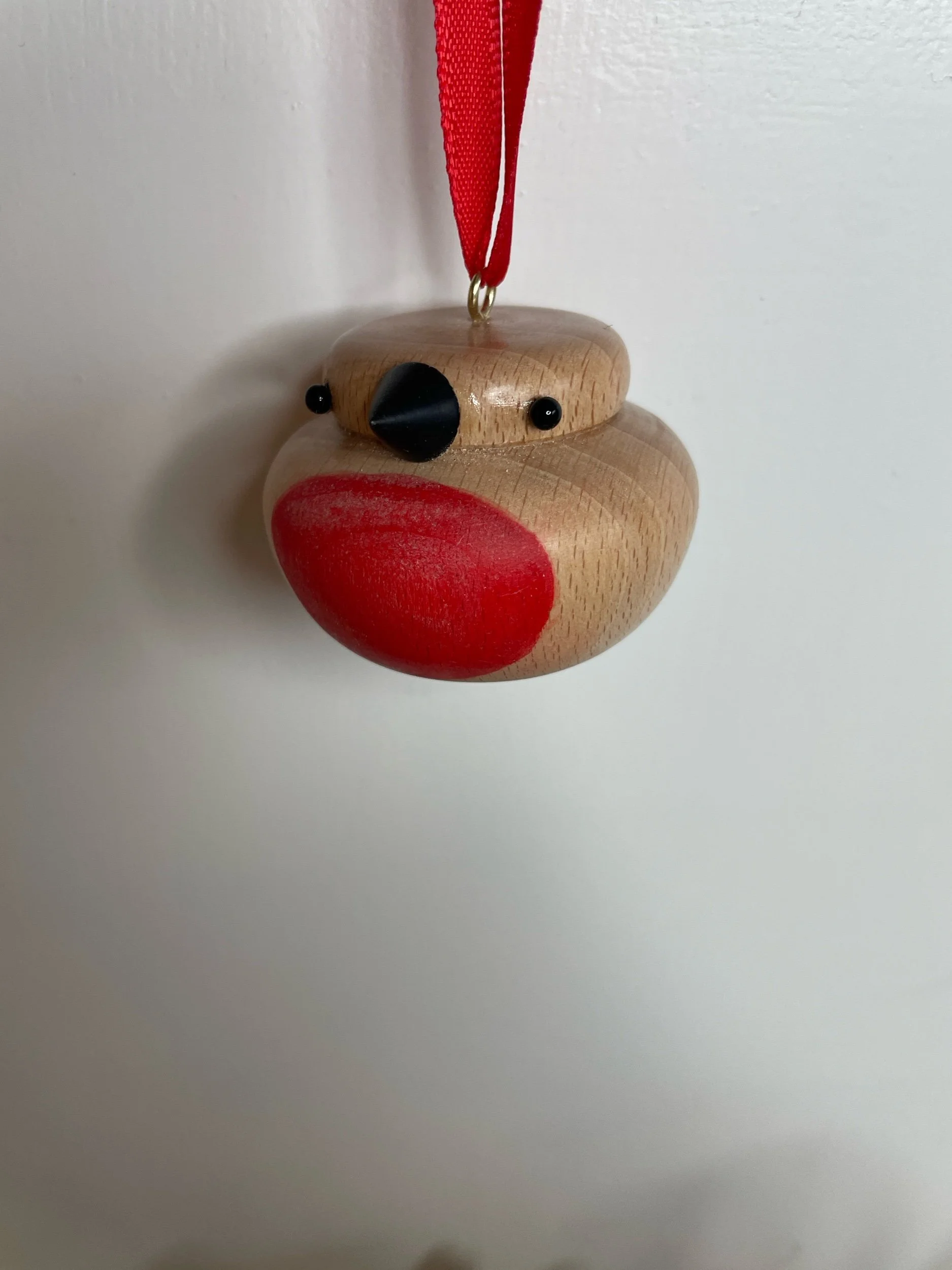 Stained red breast. Ebony nose and glass eyes. Hanging on a red ribbon